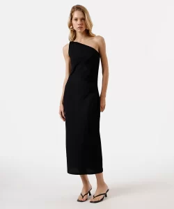 Vestido midi feminino ombro único texturizado preto